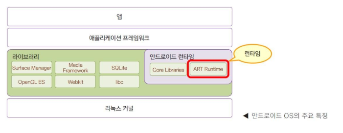 - 안드로이드에는 ART라는 런타임이 탑재 되어 있는데 이 런타임의 성능은 매우 뛰어나다. 런타임은 프로그램을 실행시키는 엔진과 같은 것인데 프로그램의 성능에 영향을 미치는 가장 중요한 요소 중 하나이다. 안드로이드에서 사용하는 자바는 예전부터 성능이 느리다는 고질적인 문제를 안고 있었다. 이 때문에 옛날에는 표준 자바를 휴대 단말에서 사용할 때 가상 머신의 속도가 느려 성능 문제가 계속 제기되었지만 안드로이드는 빠른 속도의 런타임을 만들고 성능을 지속적으로 개선했기 때문에 현재는 성능 문제가 거의 없다.