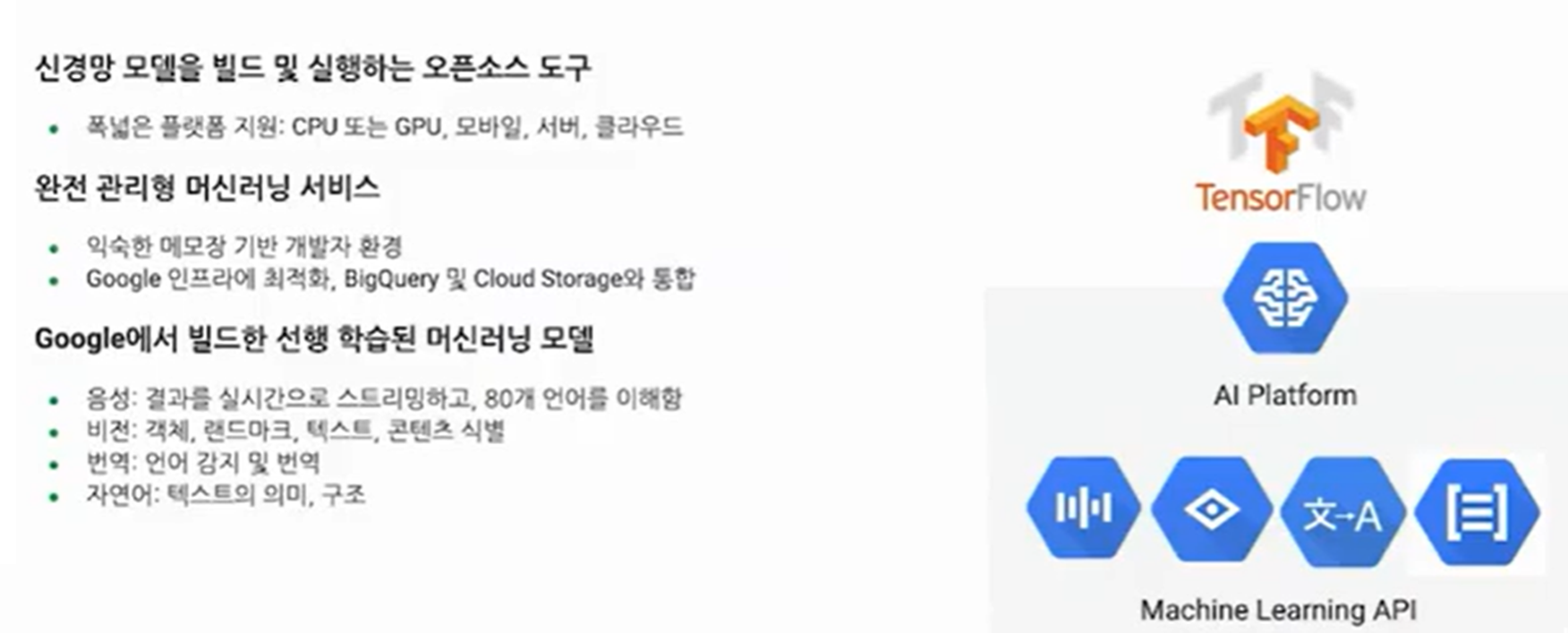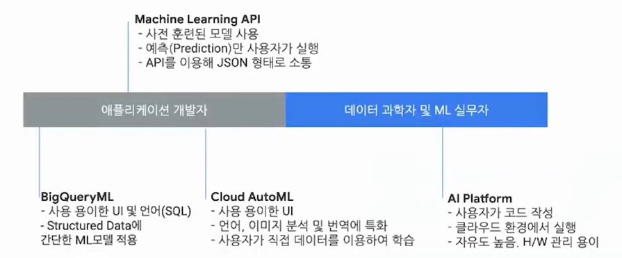 아래의 제품 BigQueryML, Cloud AutoML, AI Platform 3개 제품은 학습과 예측 2단계를 모두 수행할 수 있습니다. 그에 비해 ML API는 예측만 수행하게 됩니다.