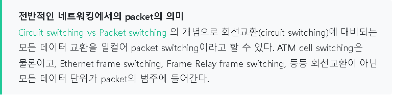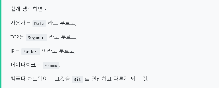 - IP Packet : IP packet에서의 packet은 이 사용자 datagram을 layer-2의 MTU에 맞춰서 토막을 낸 상태. 그러니까 packet은 토막난 상태의 사용자 정보 스트림을 말한다.