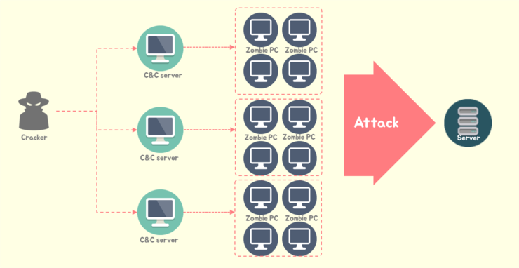 1. 먼저 다른사람의 컴퓨터시스템에 무단으로 침입하여 정보를 훔치거나 프로그램을 훼손하는 크래커(Cracker)가 다양한 방법으로 악성코드를 유포하여 사용자PC들을 감염시킵니다. 이렇게 감염된 PC들을 좀비PC라고 부르는데요. 보통 인터넷의 검증되지 않은 파일을 다운받거나 설치하는 방법으로 감염되며, 자신의 PC가 좀비피씨인지 모르는 경우가 많습니다. 감염된 PC는 이후 크래커의 명령에 따라 DDoS 공격을 실행하는 좀비PC가 됩니다.
