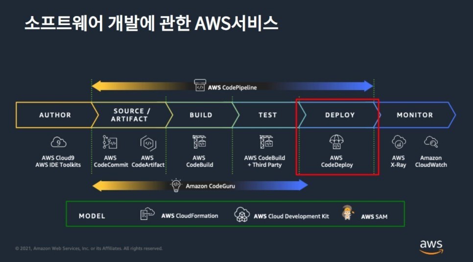 애플리케이션을 구성하는 파일 군(아티팩트)의 디플로이를 자동화하는 AWS의 매니지드 서비스입니다.