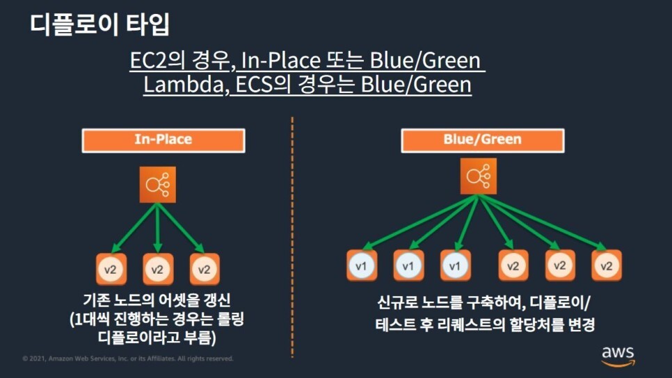 CodeDeploy를 사용하는 것으로 디플로이의 다운타임을 줄이거나 디플로이 시의 재처리를 쉽게 할 수 있습니다.
