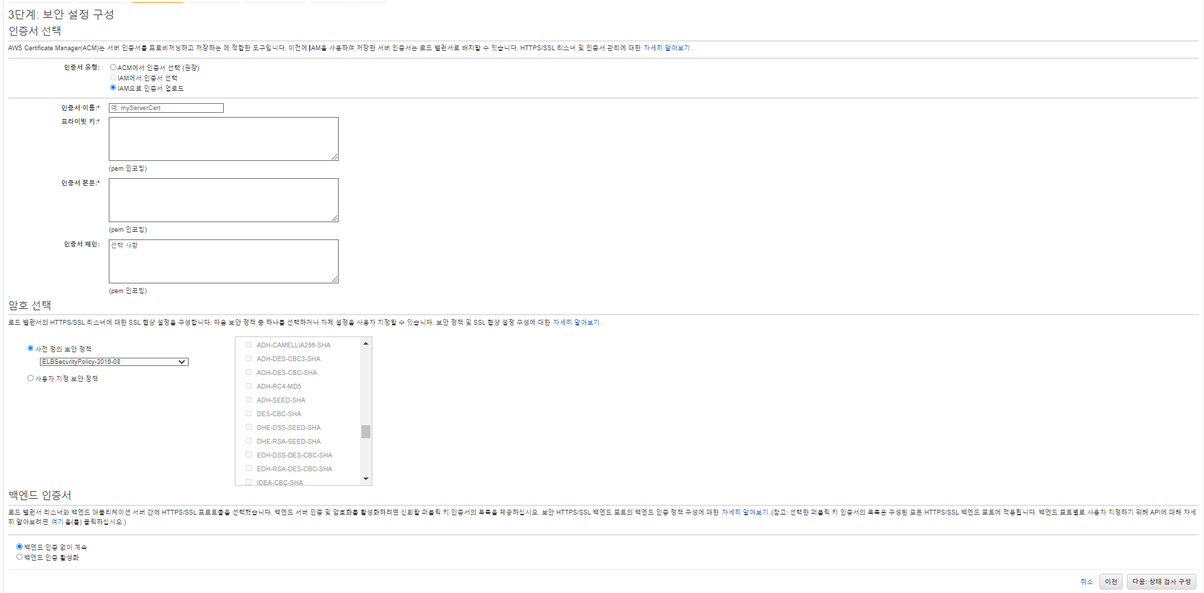 6. 인증서, 암호, 백엔드 인증서를 선택해줍니다.