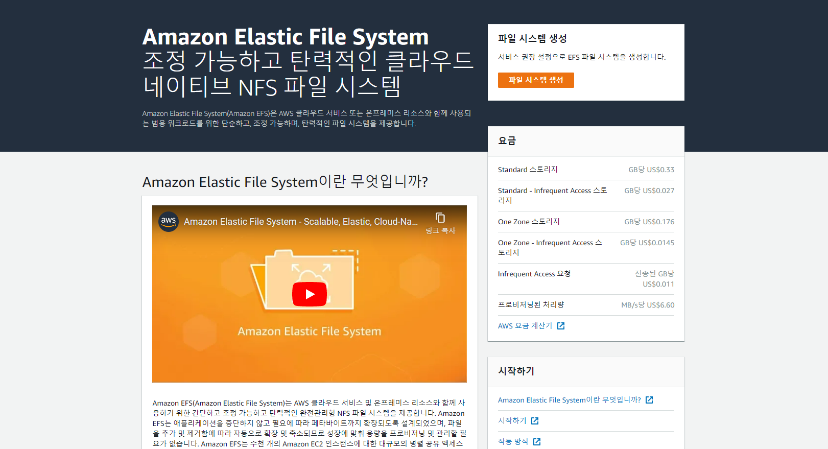 Amazon EC2 인스턴스에 사용할 수 있는 간단하고 확장 가능한 파일 스토리지를 제공합니다. Amazon EFS는 사용이 간편하며, 파일 시스템을 쉽고 빠르게 생성 및 구성할 수 있는 간단한 인터페이스를 제공합니다.