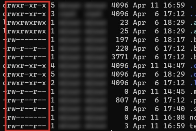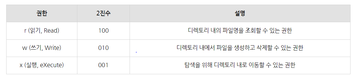 그리고 각 글자는 읽기(Read, r), 쓰기(Write, w), 실행 (eXecute, x) 권한을 나타냅니다.