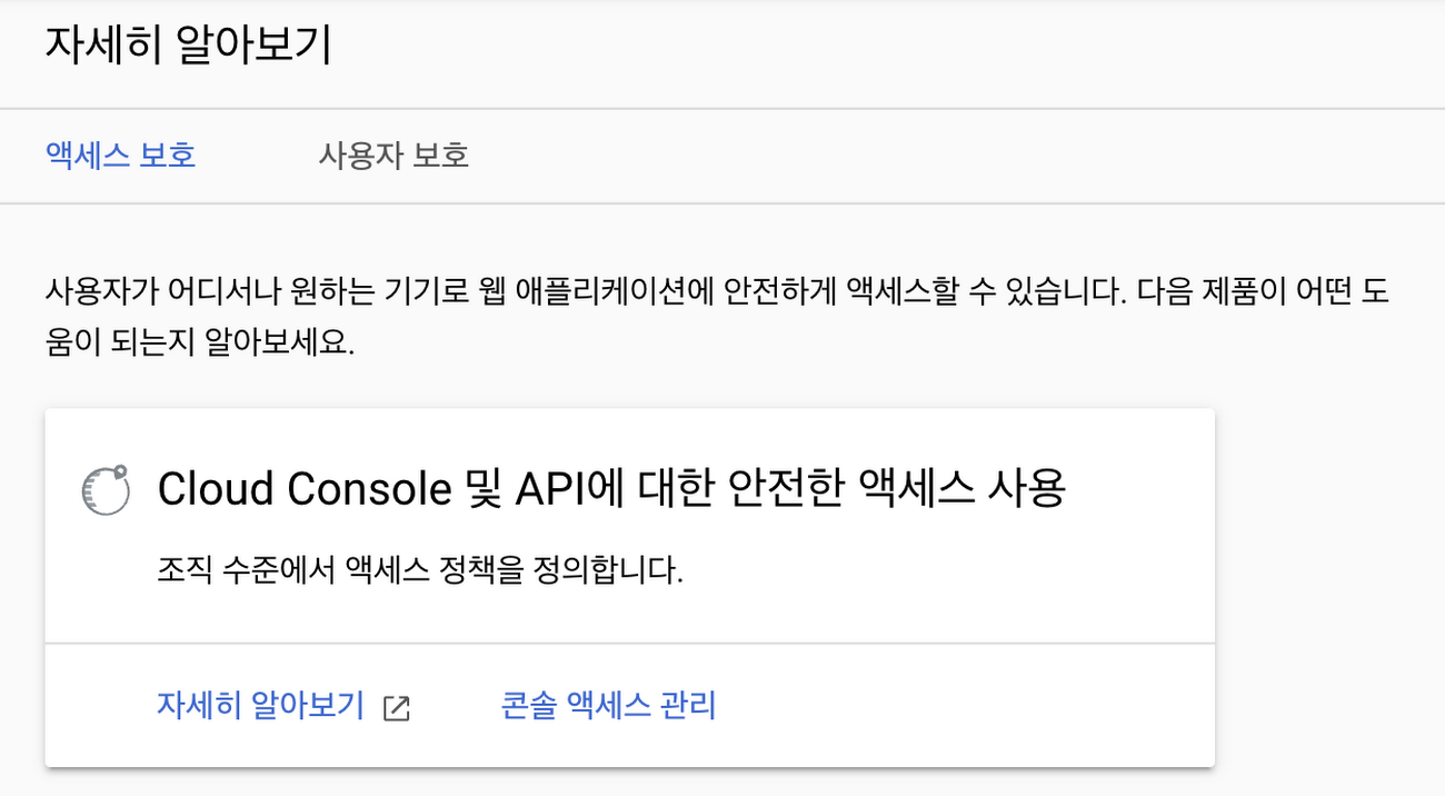 클라우드 웹 콘솔 -> 보안 -> BeyondCorp Enterprise 메뉴를 선택합니다. 화면에서 BeyonCorp Enterprise 시작하기가 보입니다. 액세스 및 사용자 보호 알아보기를 클릭합니다. 이제 화면 오른쪽에 아래와 같은 자세히 알아보기 메뉴가 나타납니다. 가장 위의 항목인 Cloud Console 및 API에 대한 안전한 액세스 사용을 확인하고 콘솔 액세스 관리를 클릭합니다.