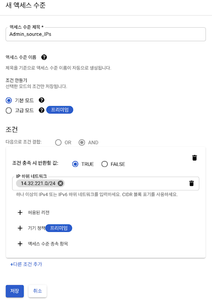 - 기본 모드/고급모드: 기본 모드는 메뉴에서 선택하는 것이며 고급모드는 CEL(Common Expression Language)을 사용 조건을 설정하는 방식입니다. 고급모드를 사용하려면 Beyondcorp Enterprise의 프리미엄 버전을 사용해야 합니다.