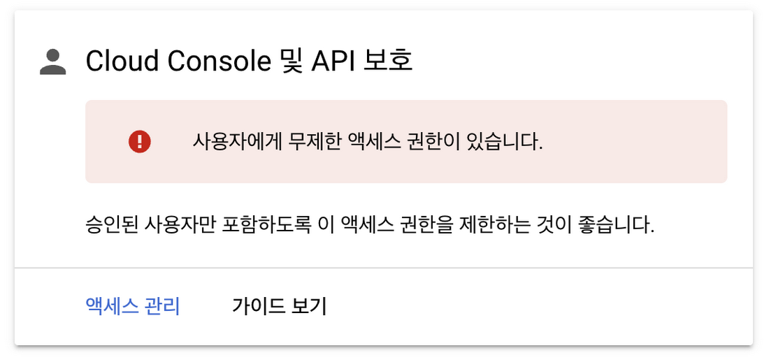 아직 아무런 접근 설정을 하지 않았으므로 무제한 액세스 권한이 있다고 안내하고 있습니다. 이러한 설정은 계정 정보가 유출될 경우 매우 위험하므로 즉시 액세스 관리를 클릭하여 보안 설정을 해야 합니다. Cloud Console 및 API의 액세스 관리 페이지로 이동하여 추가를 선택합니다.