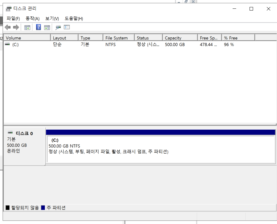 디스크 관리 > 작업 > 디스크 다시 검색 > 우클릭 > 볼륨 확장