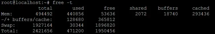 메모리에 대한 정보를 확인할 수 있습니다. 저는 Memory와 Swap에 대한 값의 총 합을 확인하기 위하여 -t 옵션을 주었습니다.