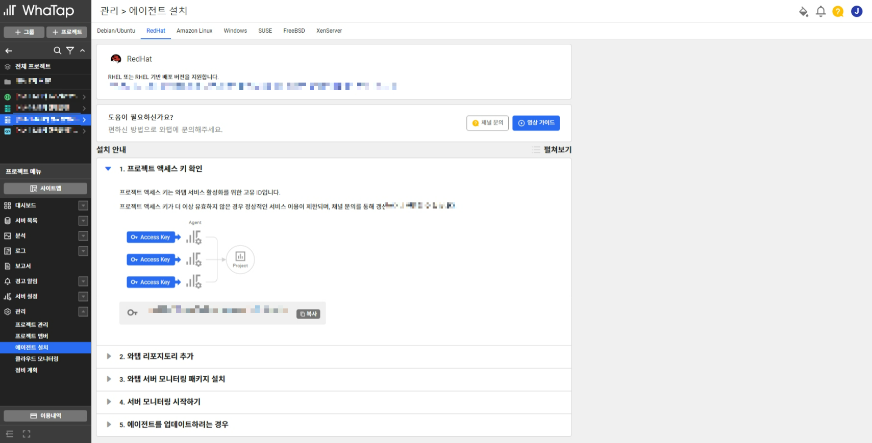 1. 좌측 프로젝트 메뉴에서 '관리 > 에이전트 설치' 부분으로 들어갑니다.