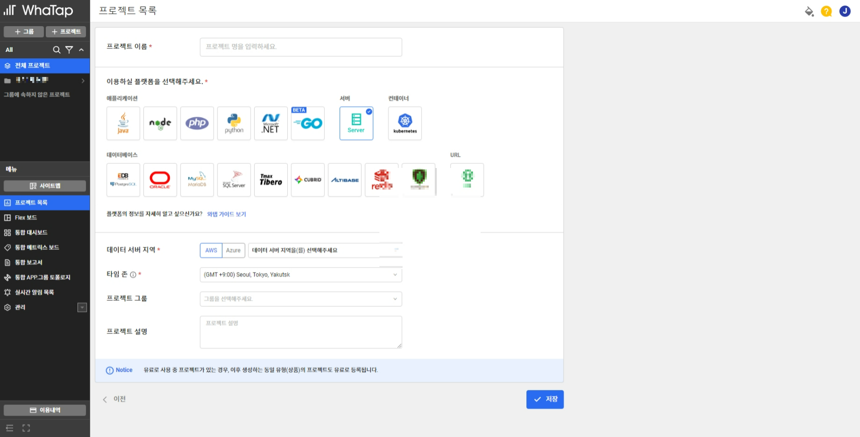 위 사진은 WhaTap에 처음 로그인 후 좌측 상단 '+프로젝트' 부분을 클릭하면 보이게 되는 화면입니다.