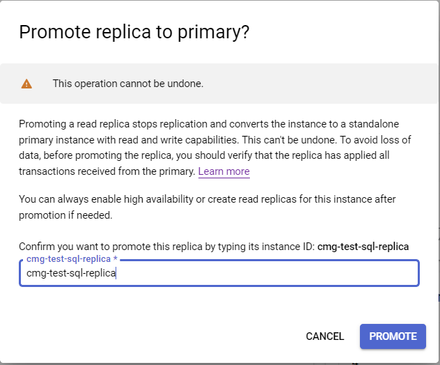 - Promote 진행할 replica 클릭 > PROMOTE REPLICA 클릭 > replica name 입력 후 PROMOTE