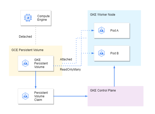 Compute Engine에 연결하여 사용하던 PV를 Detached한 후, GKE PV로 사용하여 각 Pod에 연결 할 수 있습니다.