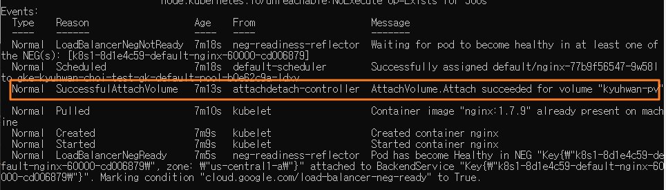 Attach 성공한 Pod 정보에서 아래와 같이 Attach 되었음을 확인합니다.