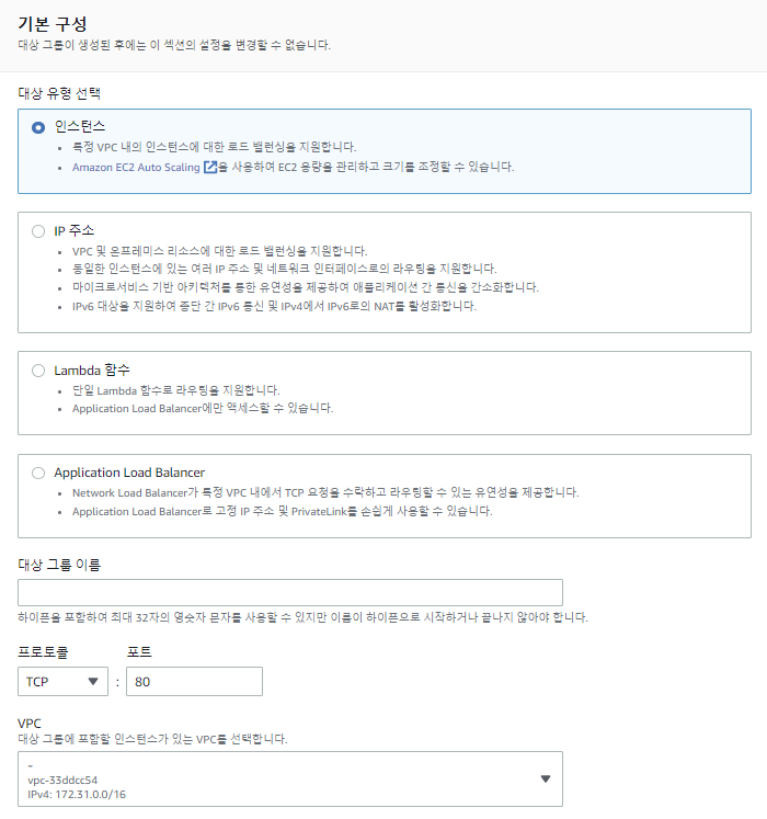 5. 4번을 하기 전에, 리스너 및 라우팅 대상을 지정해주고자 대상 그룹을 미리 만들어 줍니다.