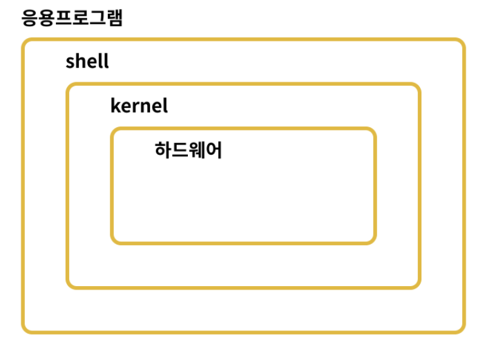 office 등의 문서편집기 혹은 웹브라우저와 같은 응용프로그램에서 사용자가 명령을 내리면 shell(셸, 쉘)은 이 명령을 해석해줍니다. shell을 명령어 해석기라고도 부르며, 해석된 사용자 입력 명령어를 kernel(커널)에게 전달합니다. kernel은 하드웨어를 제어하는 코드를 통해 소프트웨어와 커뮤니케이션을 하며, 시스템의 모든 자원을 통제/관리하는 역할을 수행합니다.