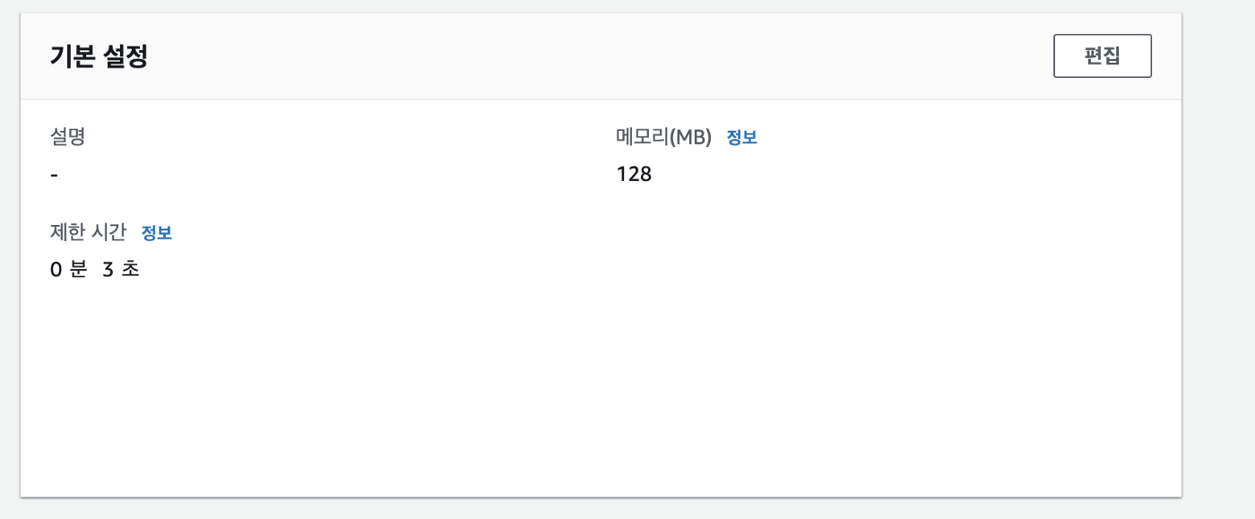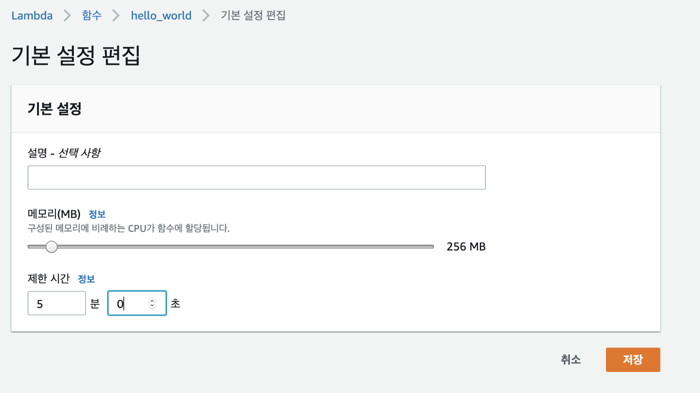 메모리는 256MB, 실행 시간은 최대 5분으로 설정!