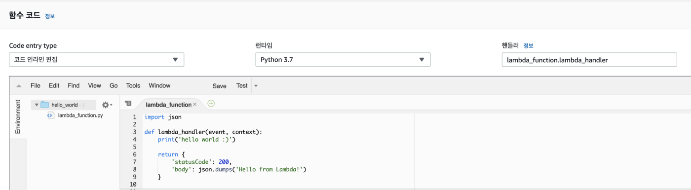 Lambda을 이용하여 hello world를 출력하는 람다 함수를 만들어보아요
