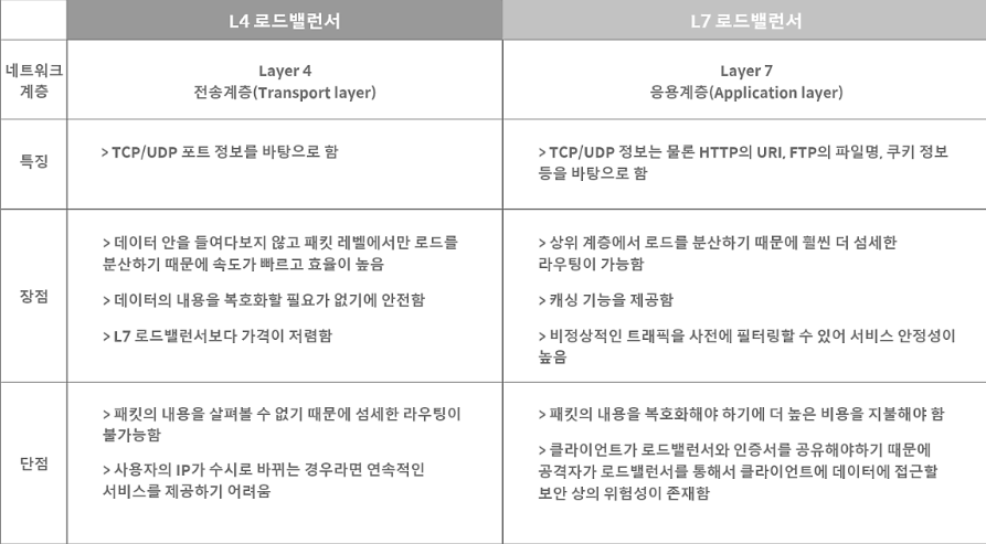 - 네트워크 계층(IP, IPX)나 트랜스포트 계층(TCP, UDP)의 정보를 바탕으로 로드를 분산