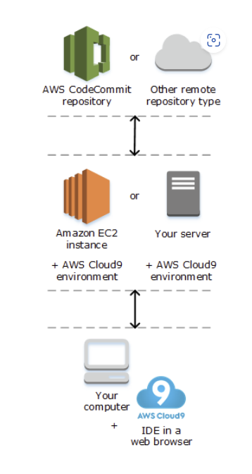 다이어그램에서 보면(아래쪽부터), 로컬 컴퓨터의 웹 브라우저를 실행하는 AWS Cloud9 IDE를 사용하여 AWS Cloud9 환경과 상호 작용합니다. 컴퓨팅 리소스(예: Amazon EC2 인스턴스 또는 자체 서버)가 해당 환경에 연결됩니다. 끝으로, AWS CodeCommit 리포지토리 또는 다른 유형의 원격 리포지토리에 작업이 저장됩니다.