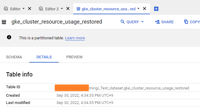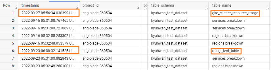 2. 삭제된 Dataset 및 Table Name을 확인합니다.