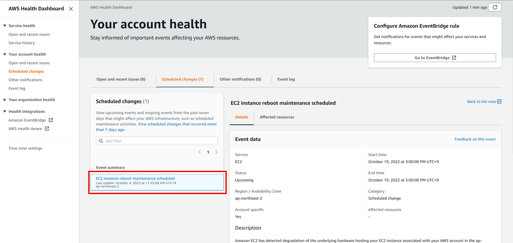 MILEAGE팀의 BTC_백만장자님이 포스팅 한 AWS Health Dashboard 에서 알 수 있듯이 AWS 이벤트에 대한 알림을 Health Dashboard에서 Event에 대한 알림과 지침을 제공해 줍니다.