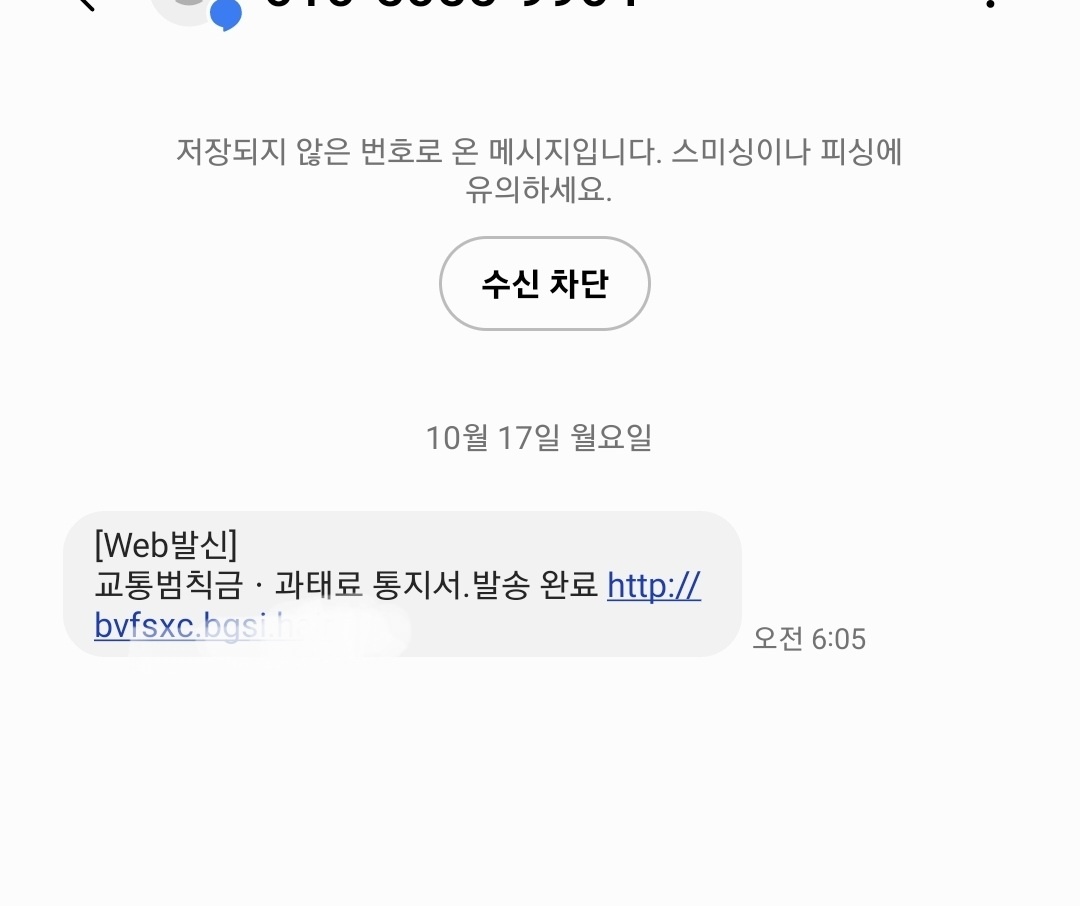 오늘 아침에 아래와 같은 문자를 받았습니다. 운전을 하지 않기 때문에 당연히 스밍싱이나 사기 겠지 하는 생각이 들었는데, 만약 기다리던 택배가 있거나 주위에 결혼을 하시는 분이 있어서 모바일 청첩장을 받은 경우라면 의심없이 링크를 열어 봤을 지도 모릅니다.