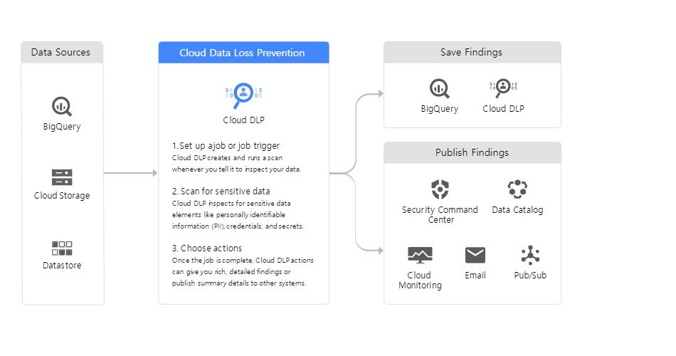 DLP(Data Loss Prevention)는 GCP상에서 API로 작동하며 민감한 데이터를 자동으로 스캔, 구분합니다. 단순한 데이터만이 아닌 구조화된 텍스트, 데이터 스트림, 저장소에 있는 파일, 이미지에 있는 데이터까지 검색할 수 있습니다.