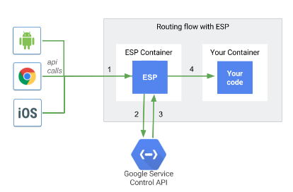 Cloud Endpoints는 nginx를 기반으로 배포되는 경량 API인 ESP(Extensible Service Proxy)를 활용하여 키 및 인증 토큰을 Service Control API가 검사한 뒤 허용된 요청만을 백엔드 서비스에 전달합니다.