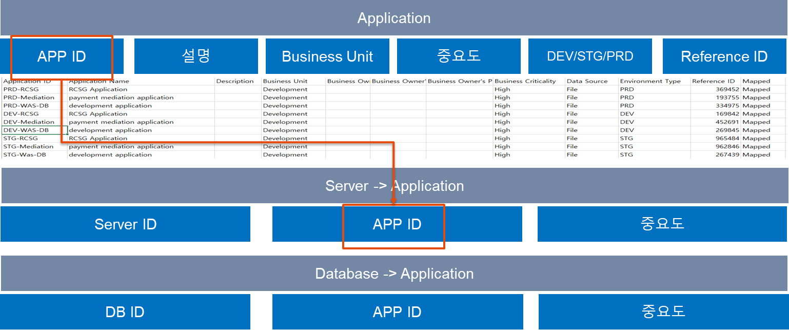 서버, DB, APP 모두 각각의 고유 ID가 있고 이 ID 이름을 기준으로 서로 Mapping을 해주는 방식입니다.