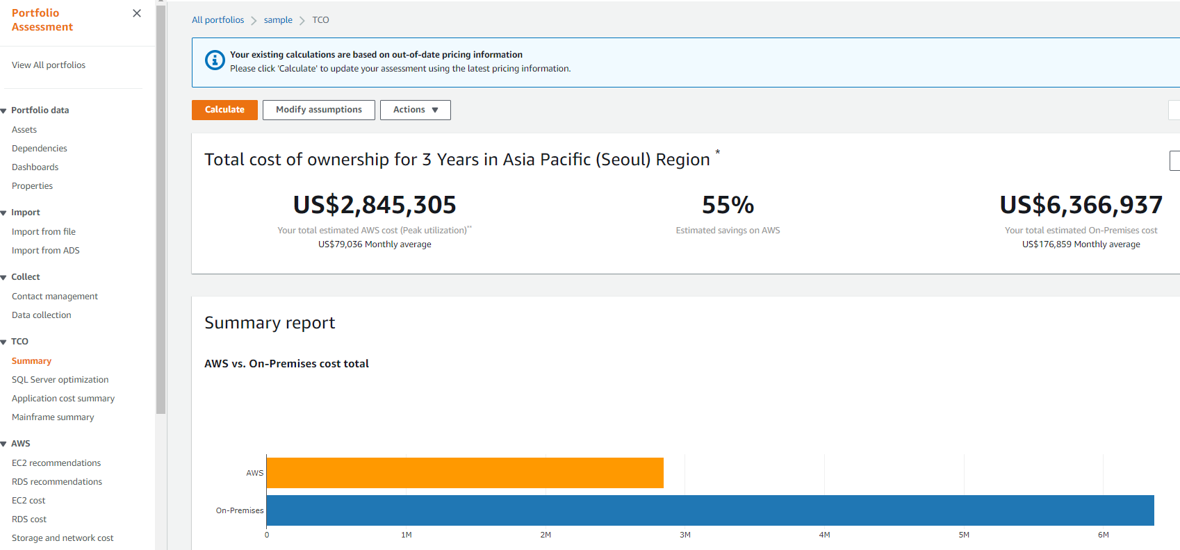 이렇게 생성된 Assets를 바탕으로 이제 TCO를 계산 할 수있습니다. 위의 이미지 왼쪽 선택 창에 보면 위에서부터