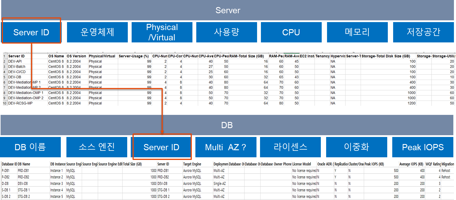 Server에는 DB를 포함한 모든 서버에 대한 내용이 들어가고 그중 DB는 추가적으로 DB 엑셀에 Server ID를 통해 Mapping을 시켜주는 모습입니다.