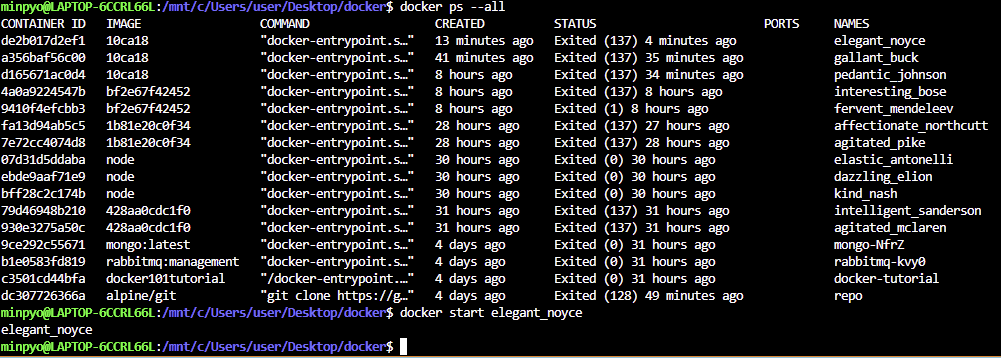 docker start -a <컨테이너 name>