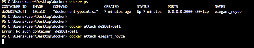 attached 모드는 단순히 그 컨테이너와 직접 통신하여 그 컨테이너의 출력결과를 수신하는 것을 의미