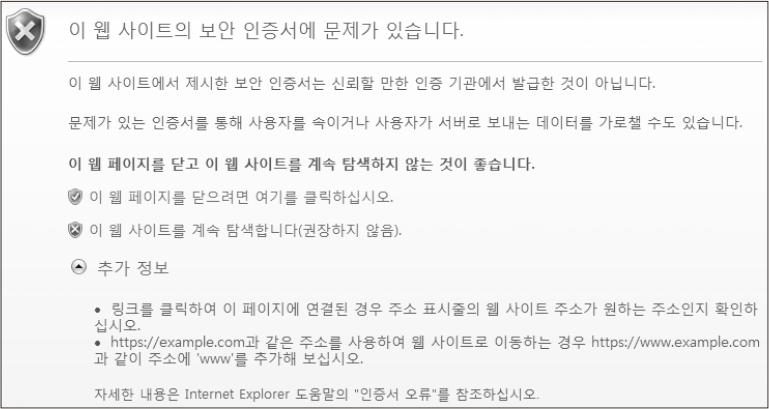 주소창의 붉은색 배경이나 ‘주의 요함’ 표시와 같이 최소한의 표시를 보여줍니다. 그러한 표시를 놓치면 안 됩니다. 인증서 보기와 같이 상세보기를 누르면 신뢰할 수 없다는 메시지를 같이 볼 수 있습니다.