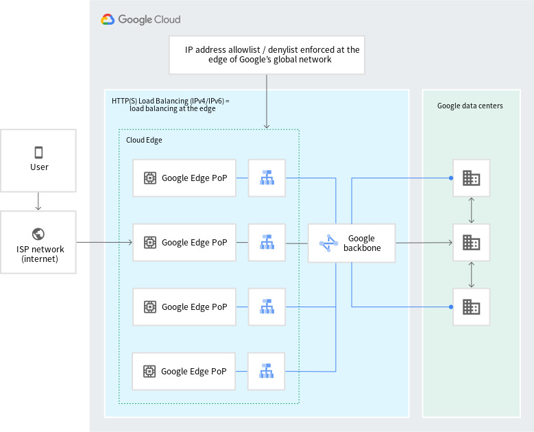 Google Cloud Armor 보안 정책을 사용 설정하면 들어오는 트래픽의 소스와 최대한 가까운 Google Cloud 에지에서 배포에 대한 액세스를 허용하거나 거부할 수 있습니다. 이를 통해 원치 않는 트래픽이 리소스를 소비하거나 Virtual Private Cloud(VPC) 네트워크에 유입되는 것을 방지할 수 있습니다.