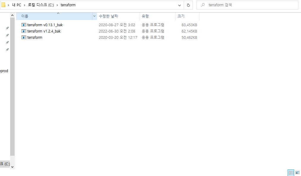 2. 내 PC > 로컬디스크 (C:)에 terraform 파일 생성 후 다운 받은 다양한 버전 terraform.exe 파일 저장