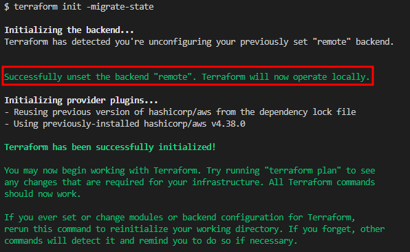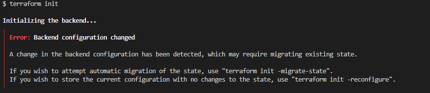 state 변경 없이 state file만 로컬에 저장하고 싶다면 -reconfigrue 옵션을 사용하라고 알려줍니다.
