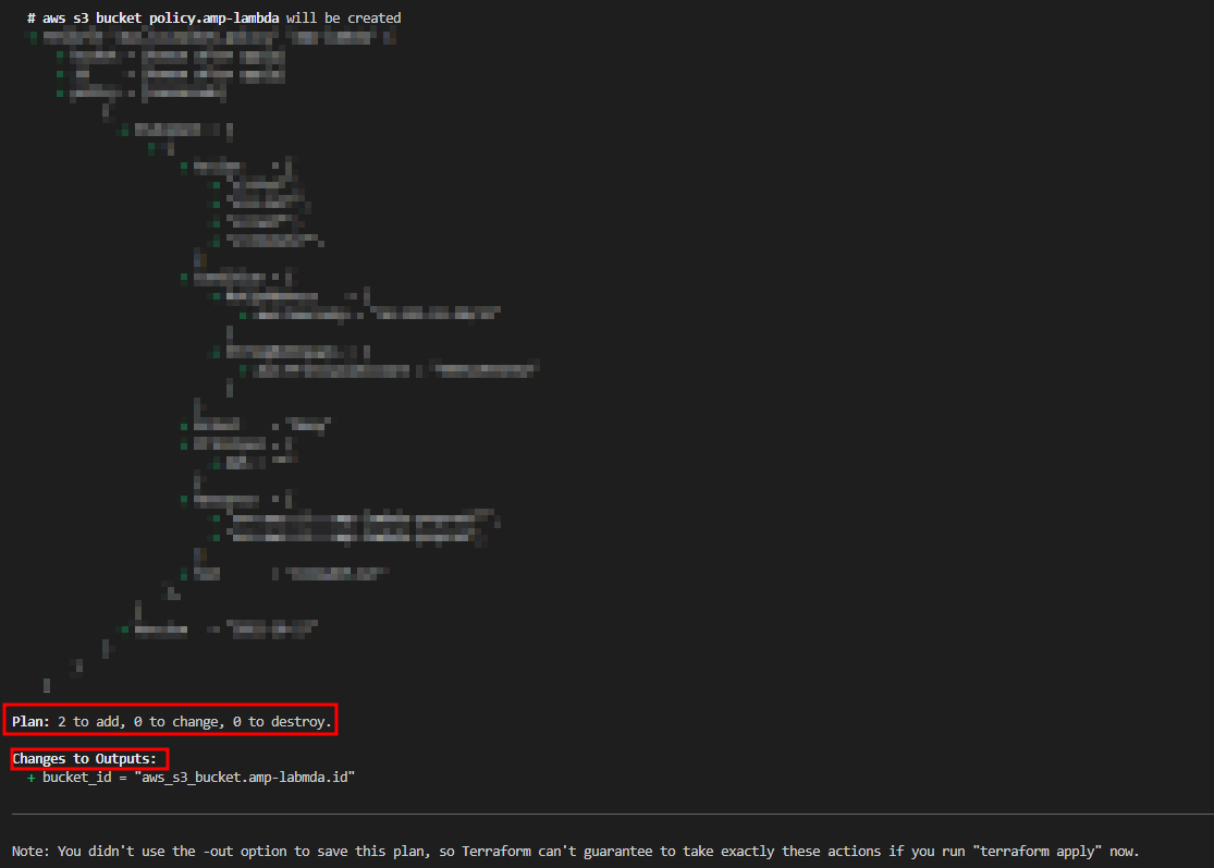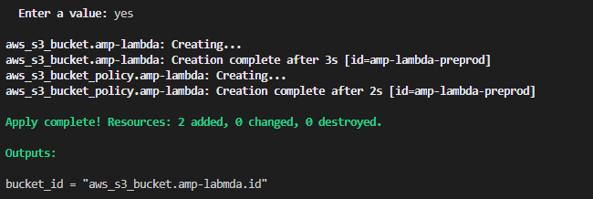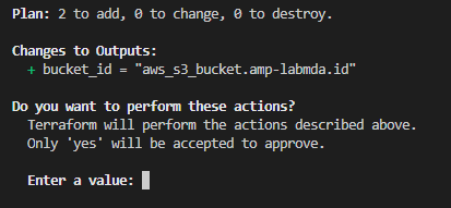 yes를 입력하면 aws_s3_bucket 리소스 amp-lambda와 aws_s3_bucket_policy 리소스