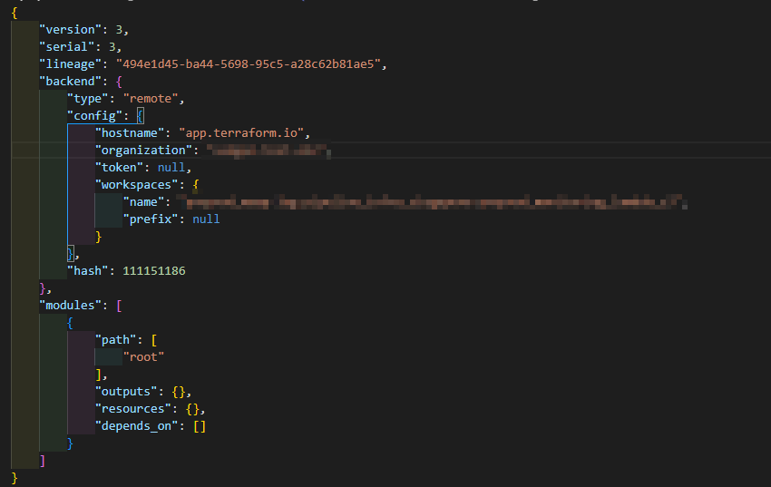 terraform.tfstate file을 열어보면 위의 그림처럼 modules와 remote라면 어느 위치에 저장하고 있는지, 참조하는 모듈이 있는지에 대한 내용이 담겨있습니다.