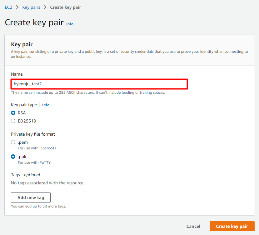 새로만들 키페어를 기존 것과 동일하게 하려면 기존 키 페어를 삭제해야 합니다. 하지만 이번 테스트에서는 삭제하지 않고 hyeonju_test2로 만들어서 키페어를 교체해 보겠습니다.