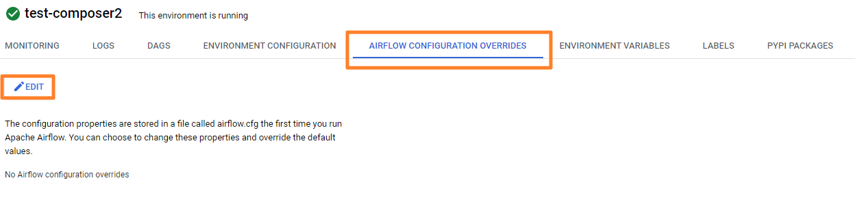 1. Composer 생성 후 이동 > AIRFLOW CONFIGURATION OVERRIDES 탭으로 이동하여 EDIT 클릭.