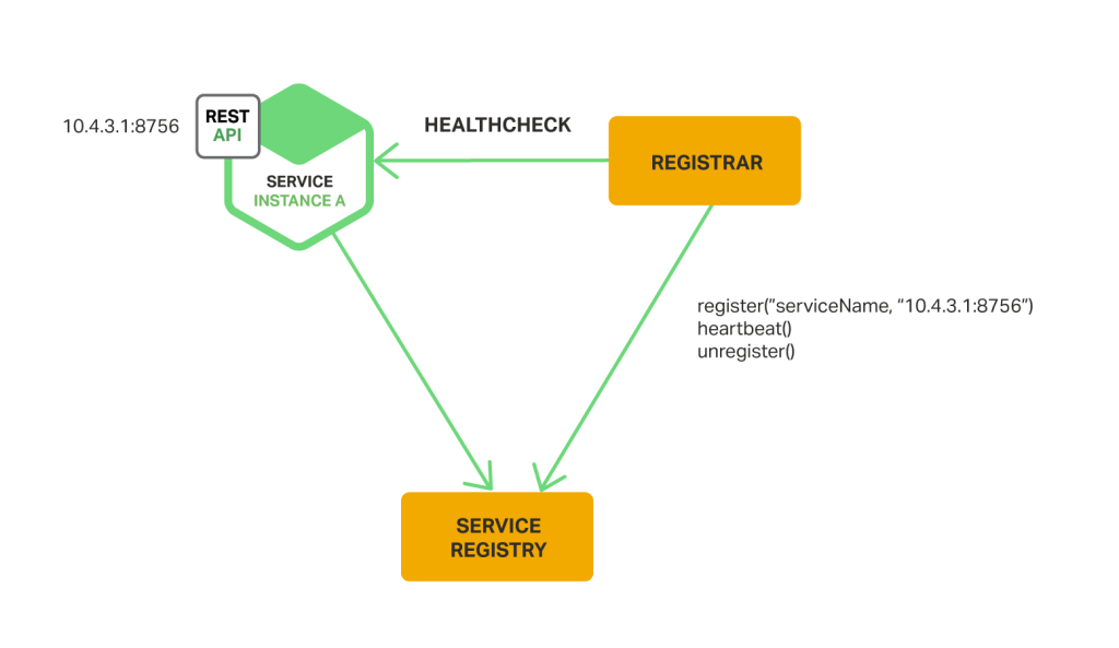 등록과 관리의 주체가 서비스인 방식으로, 각 서비스는 서비스 레지스트리에 자신의 정보를 등록하고 주기적으로 자신이 살아있다는 신호를 전송한다. 만약 이 정보가 일정 시간이 지나도 오지 않는다면 서비스에 문제가 발생한 것으로 보고 등록이 해제되며, 종료될 때에도 등록을 해제한다.