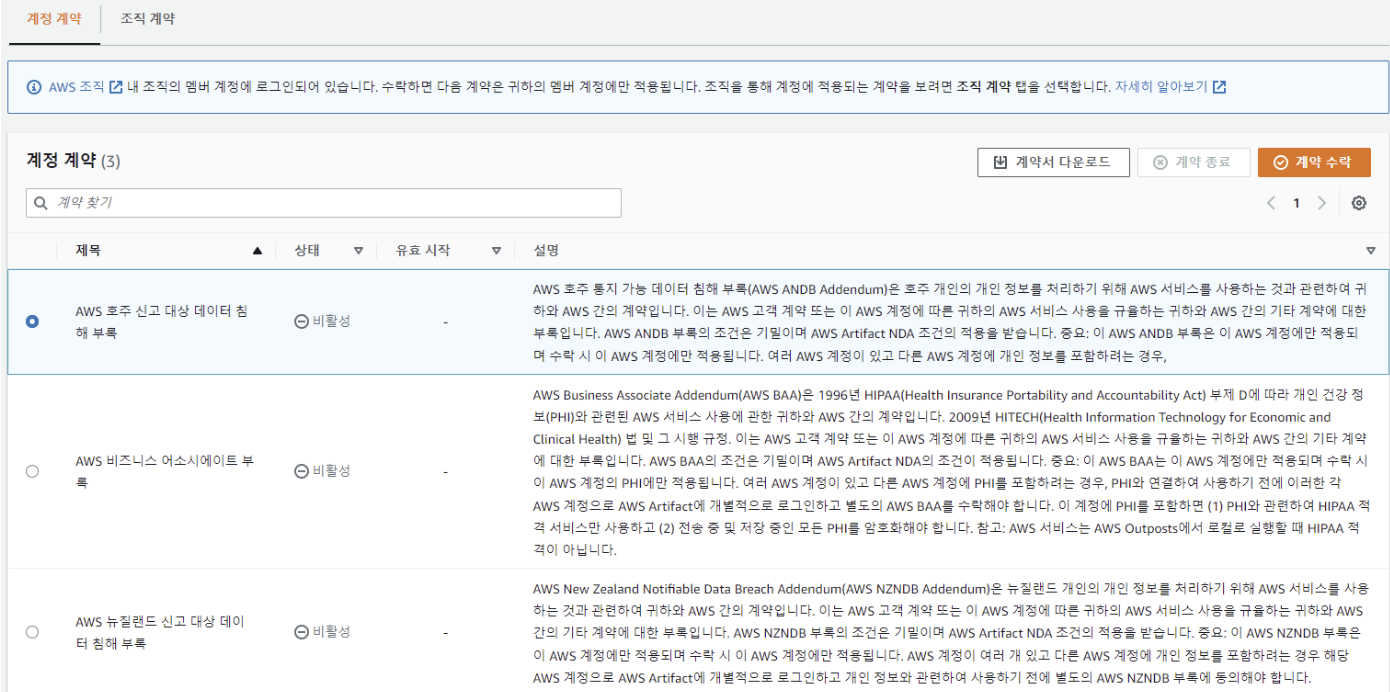 - AWS Artifact 계약을 통해 AWS Management 콘솔을 사용해 계정 또는 조직에 관한 계약을 검토하고 수락하며 관리