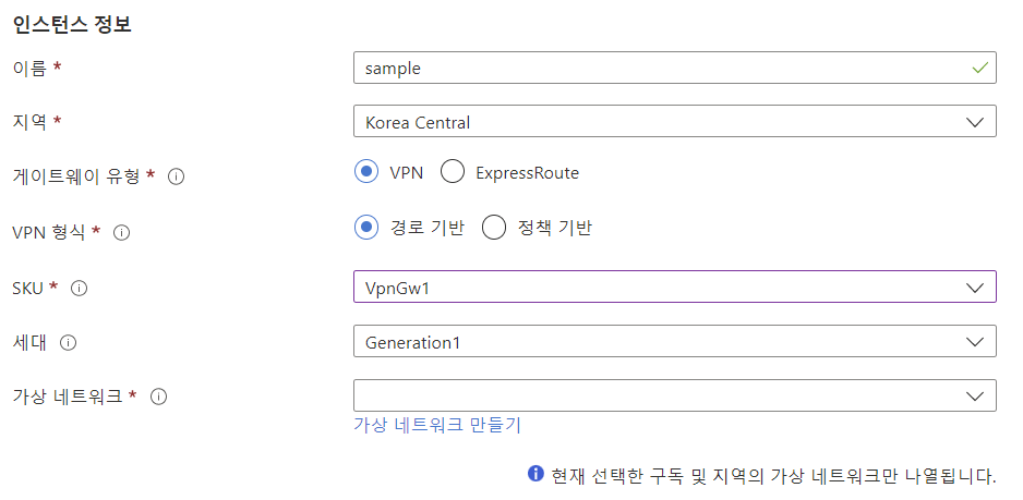 가상 네트워크 게이트웨이 이름, 지역, 유형, VPN형식, SKU, 가상 네트워크를 기입합니다.