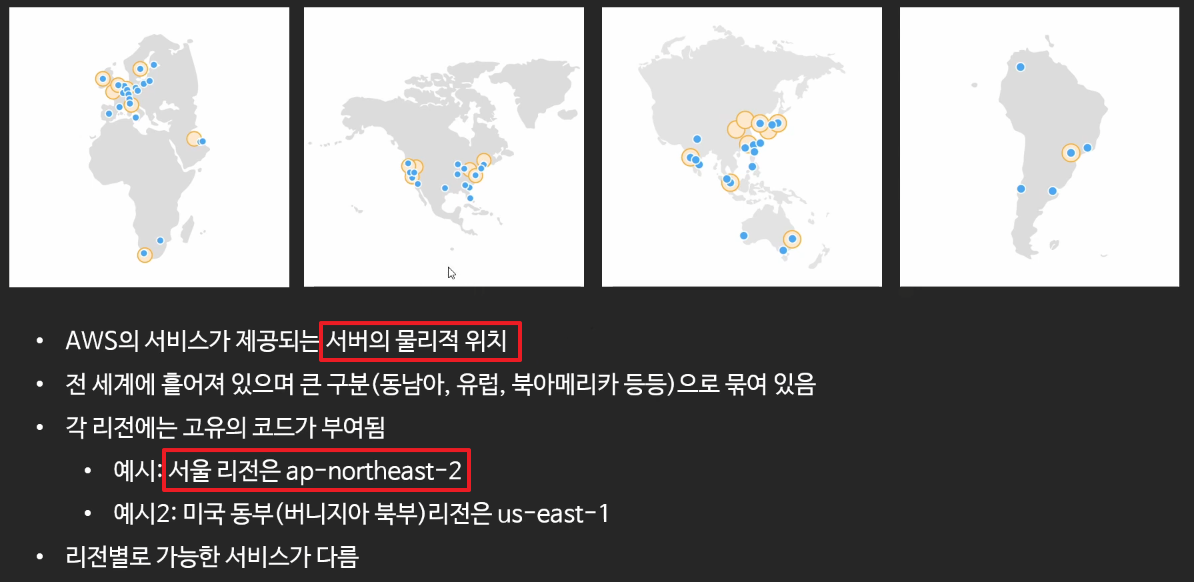 리전은 AWS의 서비스들이 제공되는 서버의 물리적인 국가/도시 단위의 위치을 의미합니다.