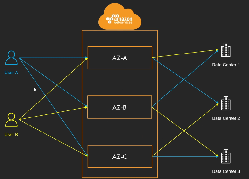사진에서 보면 user A의 AZ-A는 Data Center 2에 연결되어 있고 user B의 AZ-A는 Data Center 1에 연결되어 있다.