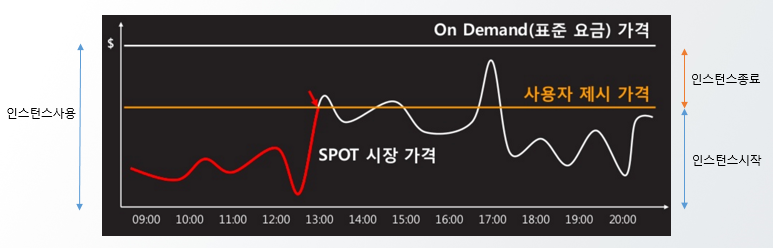 간단하게 이야기하면 서비스 배포중인 Region에 남는 EC2 리소스를 Bidding해서 실 가격보다 싸게 이용합니다. 그래서 Spot Instance의 가격은 Region별, AZ별, EC2 수요와 공급에 따라서 결정되며, 어느 순간 수요가 급증할 때는 On Demand Instance보다 가격이 높아지는 경우가 있습니다.