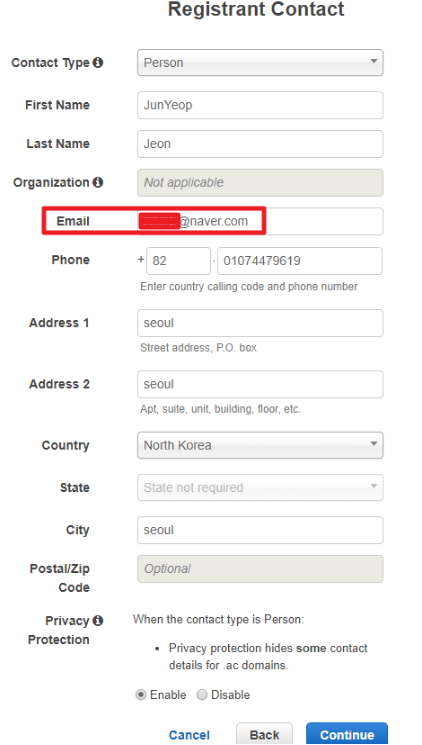 Route53에서 도메인 등록을 완료한뒤 완료가 되었으니 확인하라는 이메일을 수신할 이메일이 도착할 곳을 설정해준다
